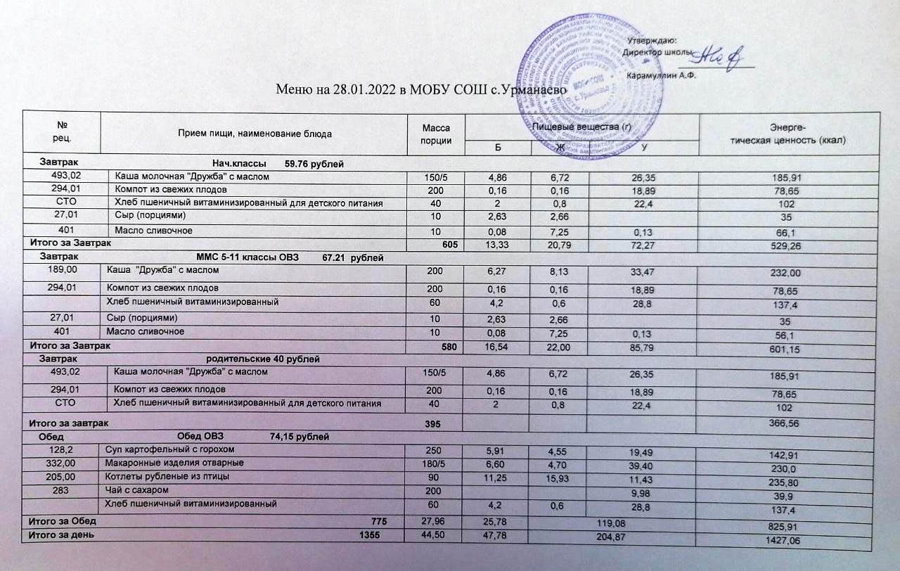 (меню на 28 январь 2022)
