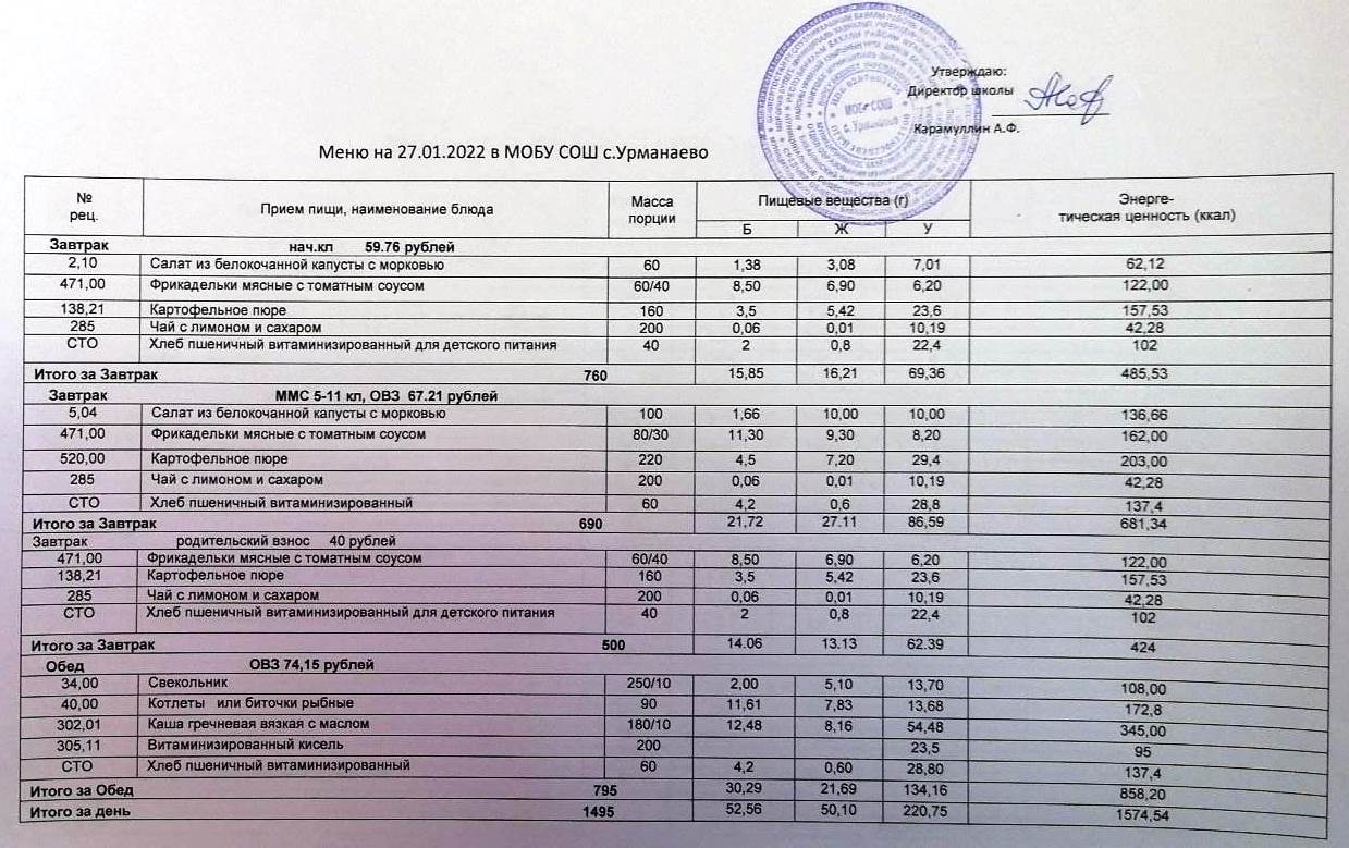 (меню на 27 январь 2022)
