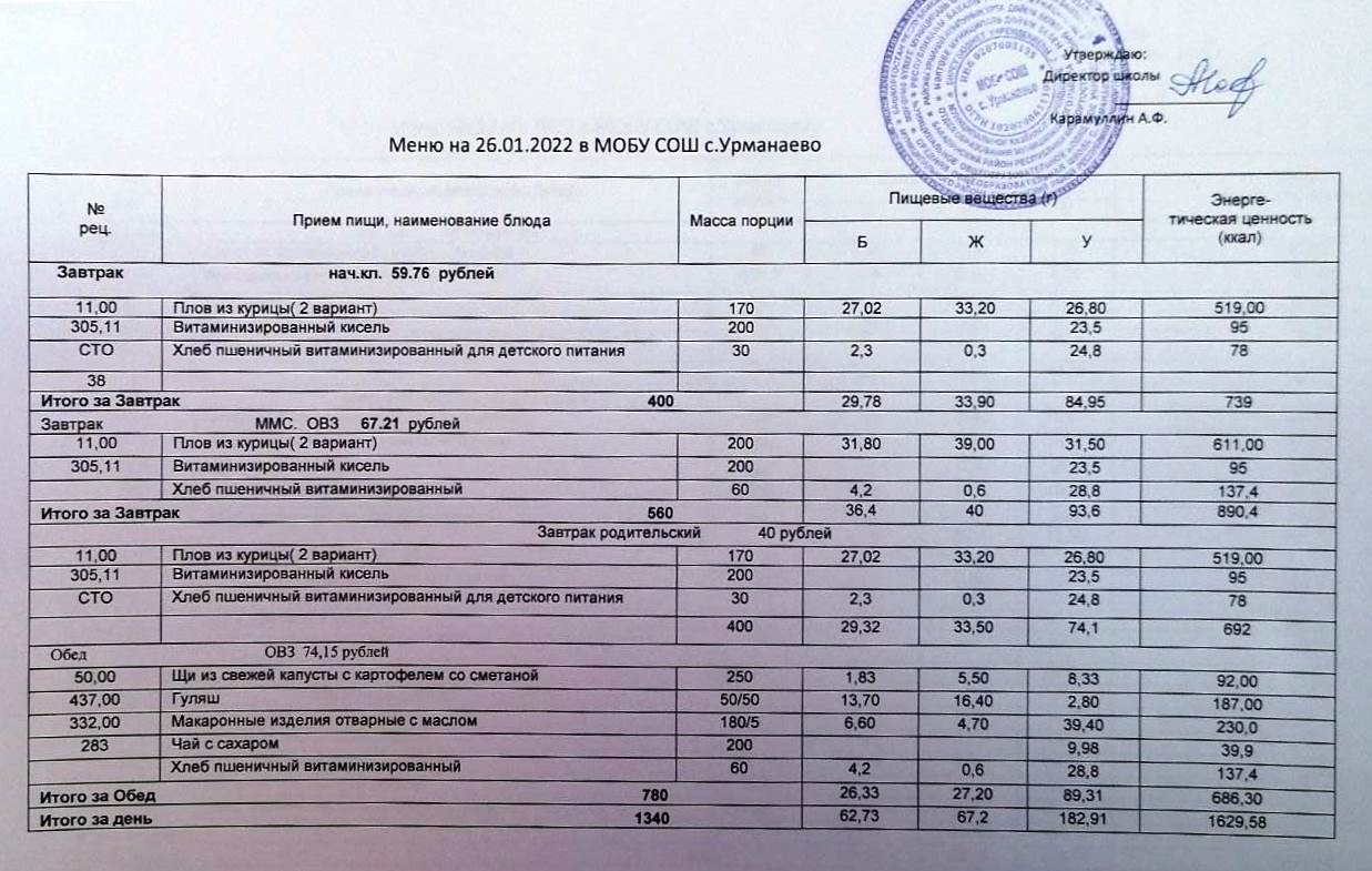 (меню на 26 январь 2022)