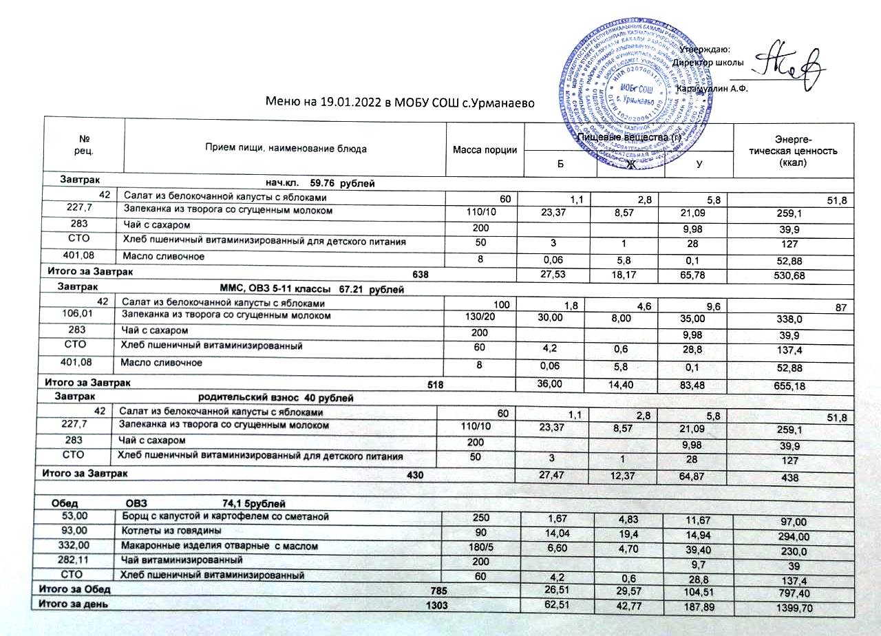 Меню на 19.01.2026            Завтрак род. взнос     Завтрак (ММС,ОВЗ)          Завтрак нач. кл.        Обед ОВЗ