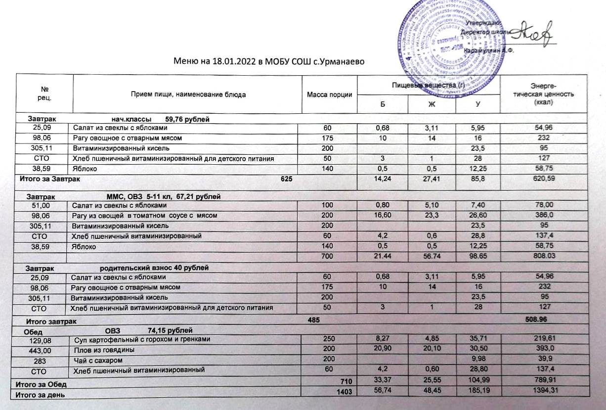 (меню на 18 январь 2022)
