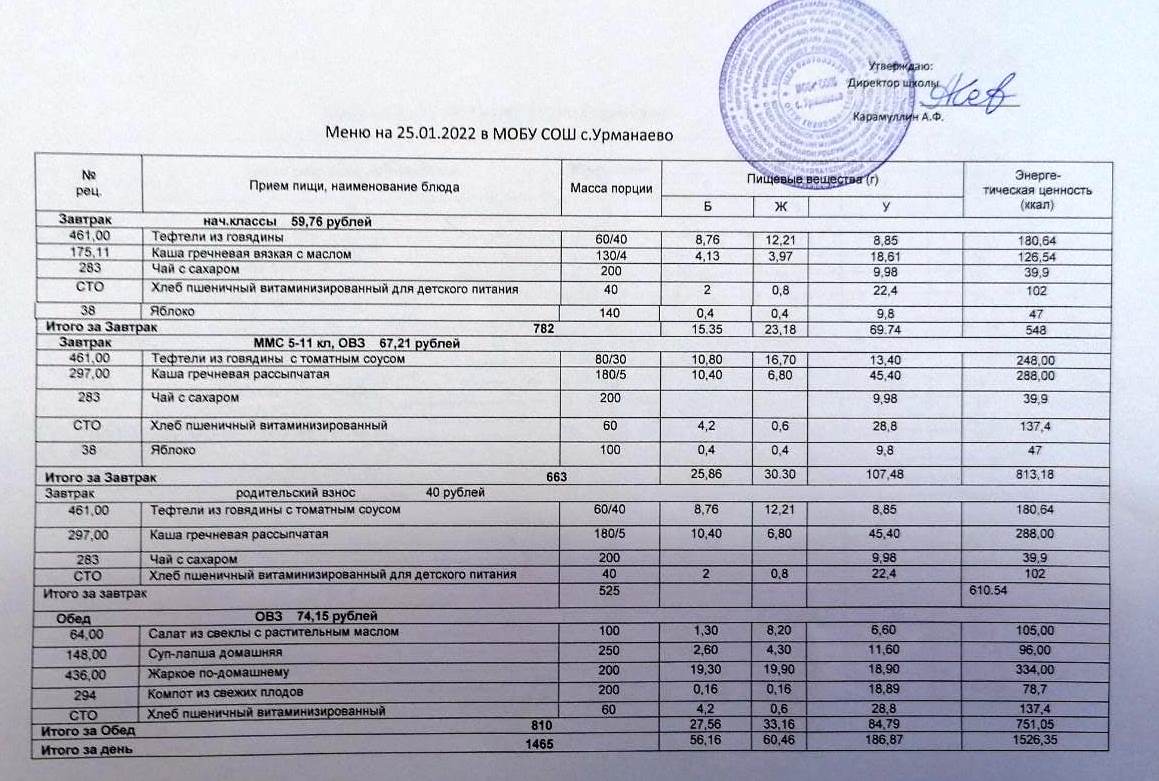 (меню на 25 январь 2022)