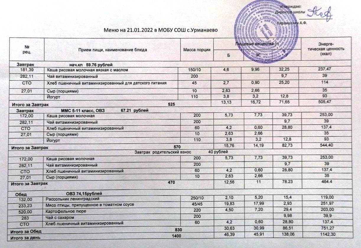 (меню на 21 январь 2022)