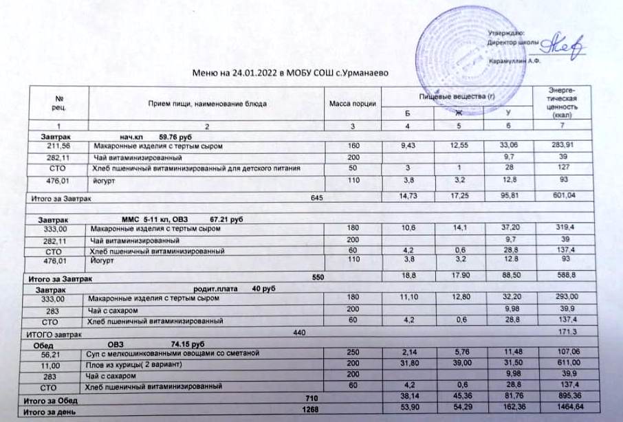 (меню на 24 январь 2022)