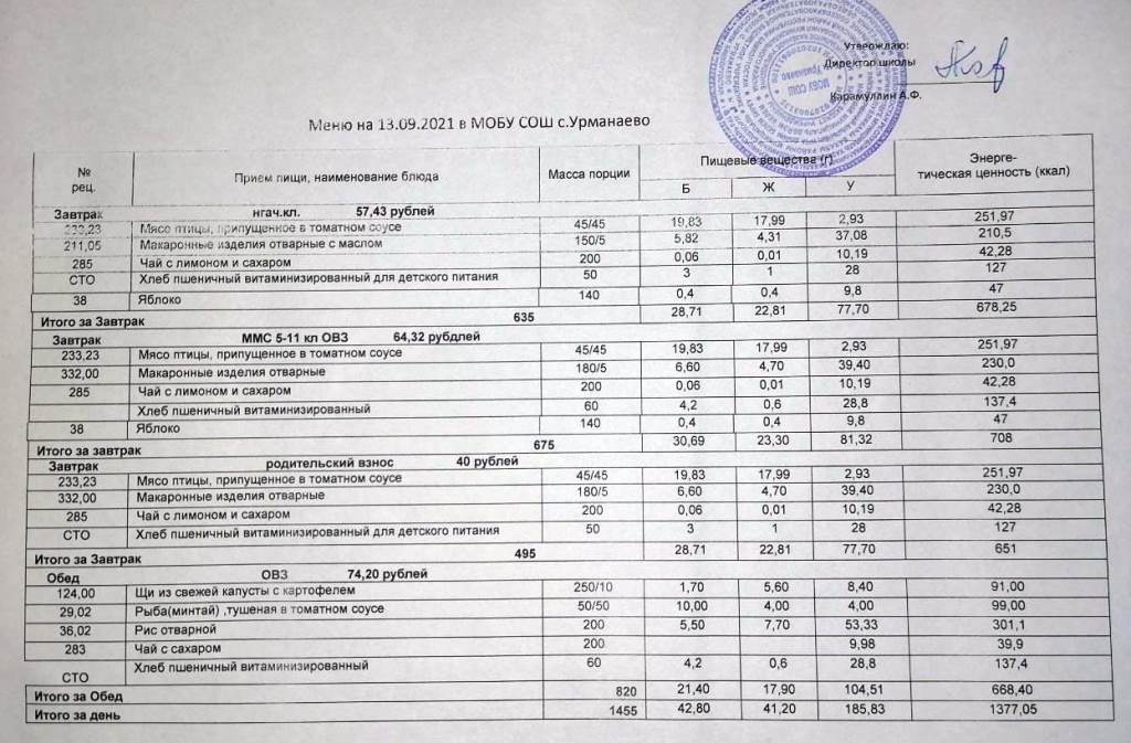 (меню на 13 сентябрь 2021)